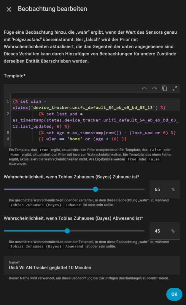Wenn du z. B. dein WLAN deaktivierst, sinkt der Wert leicht – bleibt aber über 0.6, solange andere Sensoren „Zuhause“ melden.